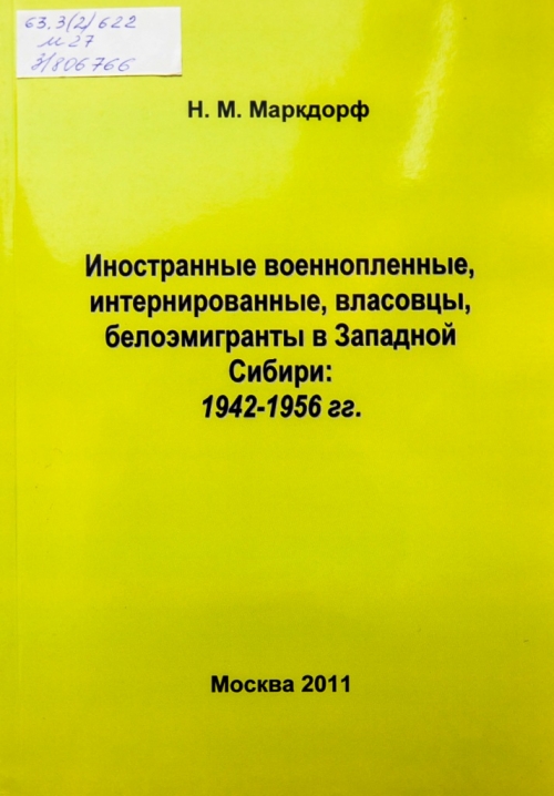 Маркдорф, Н. М. Иностранные военнопленные, интернированные, власовцы, белоэмигранты в Западной Сибири: 1942-1956 гг. / Н.М. Маркдорф. - Москва: Институт энергии знаний, 2011. – 233 с. - ISBN - 978-5-904843-03-8 ОТДЕЛ БИБЛИОТЕЧНОГО КРАЕВЕДЕНИЯ; Шифр 63.3(2)622; М27; 3/806766 ОТДЕЛ ХРАНЕНИЯ ОСНОВНОГО ФОНДА; Шифр 63.3(2)622; М27; 3/806767