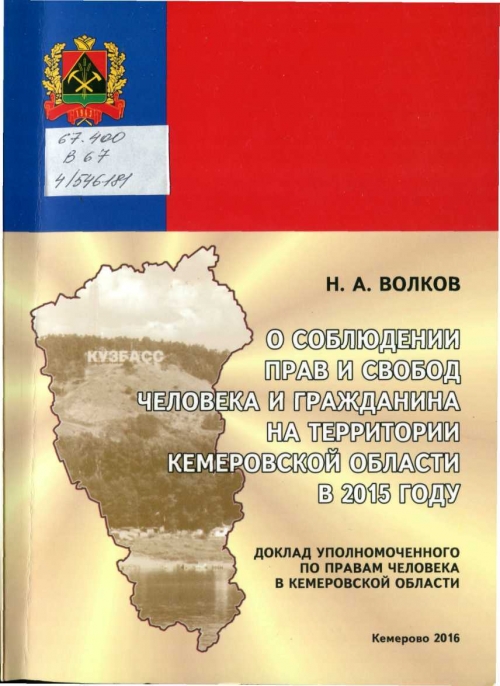 Волков, Н. А. О соблюдении прав и свобод человека и гражданина на территории Кемеровской области в 2015 году: доклад Уполномоченного по правам человека в Кемеровской области. - Кемерово: Кузбассвузиздат, 2016. – 114 с. ОТДЕЛ БИБЛИОТЕЧНОГО КРАЕВЕДЕНИЯ; Шифр 67.400; В67; 4/546181 ОТДЕЛ ХРАНЕНИЯ ОСНОВНОГО ФОНДА. КРАЕВЕДЧЕСКИЙ ФОНД; Шифр 67.400; В67; 4/546182