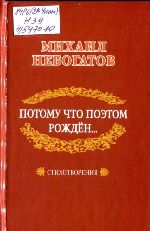 Небогатов, М. А. Потому что поэтом рожден... : стихотворения : избранное к 95-летию со дня рождения / Михаил Небогатов ; [ред. В. А. Никулина, А. М. Небогатов ; сост.: И. М. Инякина ; худож. В. П. Кравчук ; Кемеровская областная научная библиотека им. В. Д. Федорова]. - Кемерово: [Кемеровская областная научная библиотека им. В. Д. Федорова], 2016. – 160 с. - 12+ ОТДЕЛ БИБЛИОТЕЧНОГО КРАЕВЕДЕНИЯ; Шифр 84Р6(2Р-4Кем); Н39; 4/547010 ОТДЕЛ ХРАНЕНИЯ ОСНОВНОГО ФОНДА. КРАЕВЕДЧЕСКИЙ ФОНД; Шифр 84Р6(2Р-4Кем); 4/547011