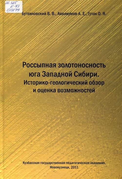 Бутвиловский, В. В. Россыпная золотоносность юга Западной Сибири. Историко-геологический обзор и оценка возможностей / Бутвиловский В. В., Аввакумов А. Е., Гутак О. Я. ; Федеральное агентство по образованию, Государственное образовательное учреждение высшего профессионального образования Кузбасская государственная педагогическая академия, Естественно-географический факультет, Кафедра физической географии и геологии, НИЛ "Палеонтологии и палеографии". - Новокузнецк : КузГПА, 2011. - 241 с. : ил., цв. ил., табл.